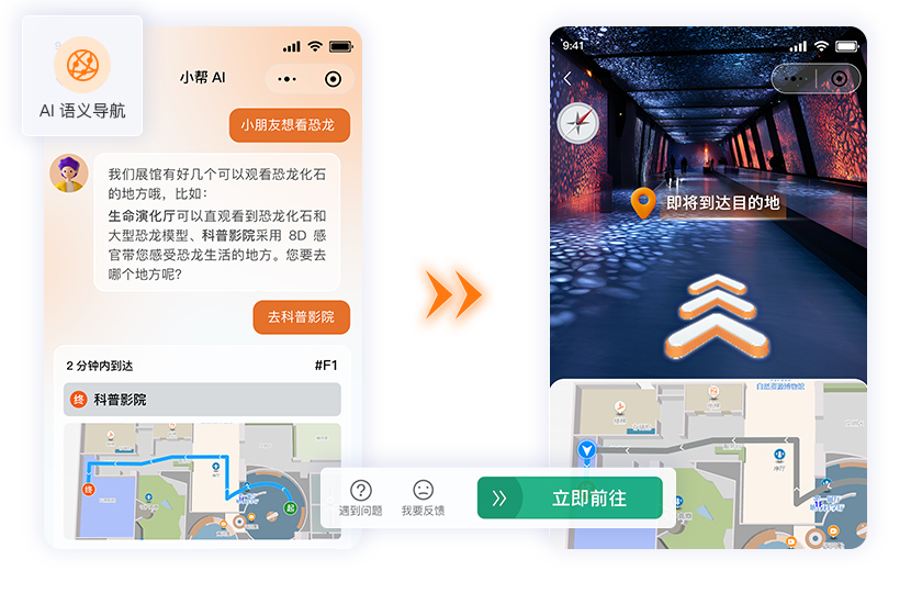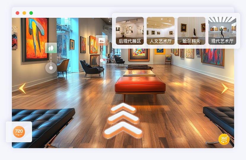 展馆导航路径以720°VR全景进行展示,辅助用户识别周围环境,快速达到目的地。