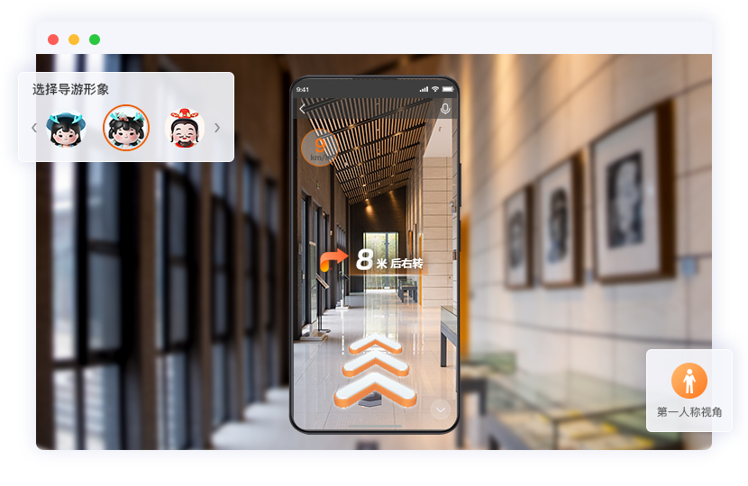 虚拟导航路线与实景画面结合,第一视角实时动态路线指引,方位自动识别与纠偏,可定制数字导航卡通形象。