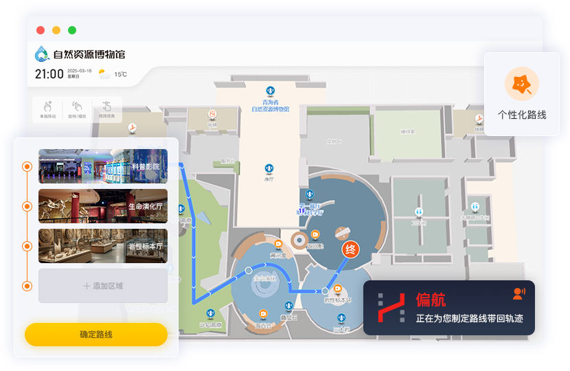 根据运营需求和展馆特色,设定推荐游览路线;游客也根据自身需求,设定自由路线,当偏离路线时,系统语音报错提示。