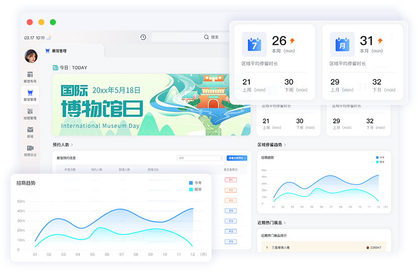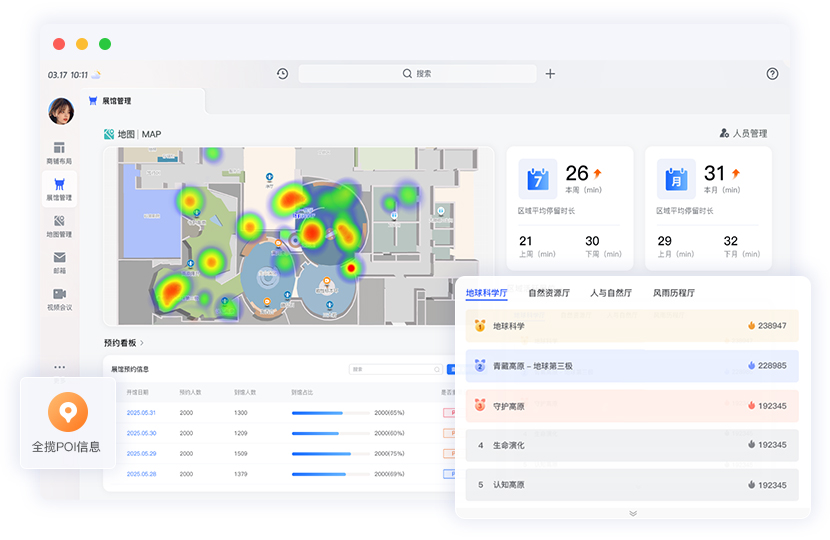 根据使用频次对目的地的排名及展示,监控人流分布,优化场馆布局。