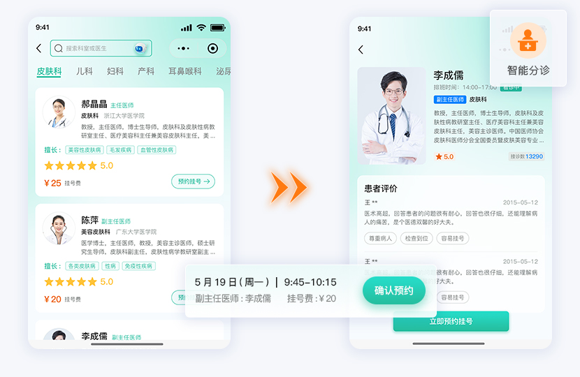 基于医学知识图谱和深度学习等人工智能技术,结合医院预检分诊场景,为患者智能推荐就诊科室和医生,减少医患资源错配等问题,提升就诊精准性和效率。