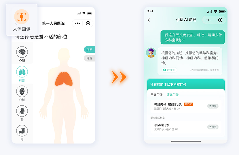 患者可通过人体画像选择症状部位,了解对应病症信息和推荐就医科室。