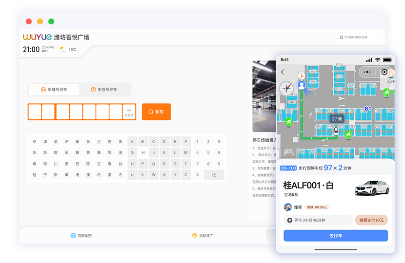 蓝牙定位车辆实时位置,同时提供空闲车位导航路线,实现快速停放车辆。