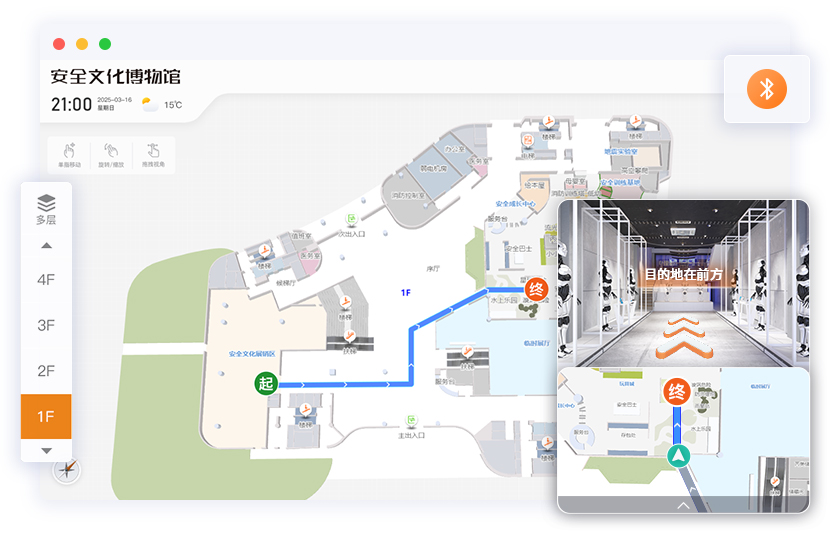 采用蓝牙定位技术,实时显示游客位置,提供3D地图定位导航、AR实景导航、VR全景导航,支持微信位置共享。