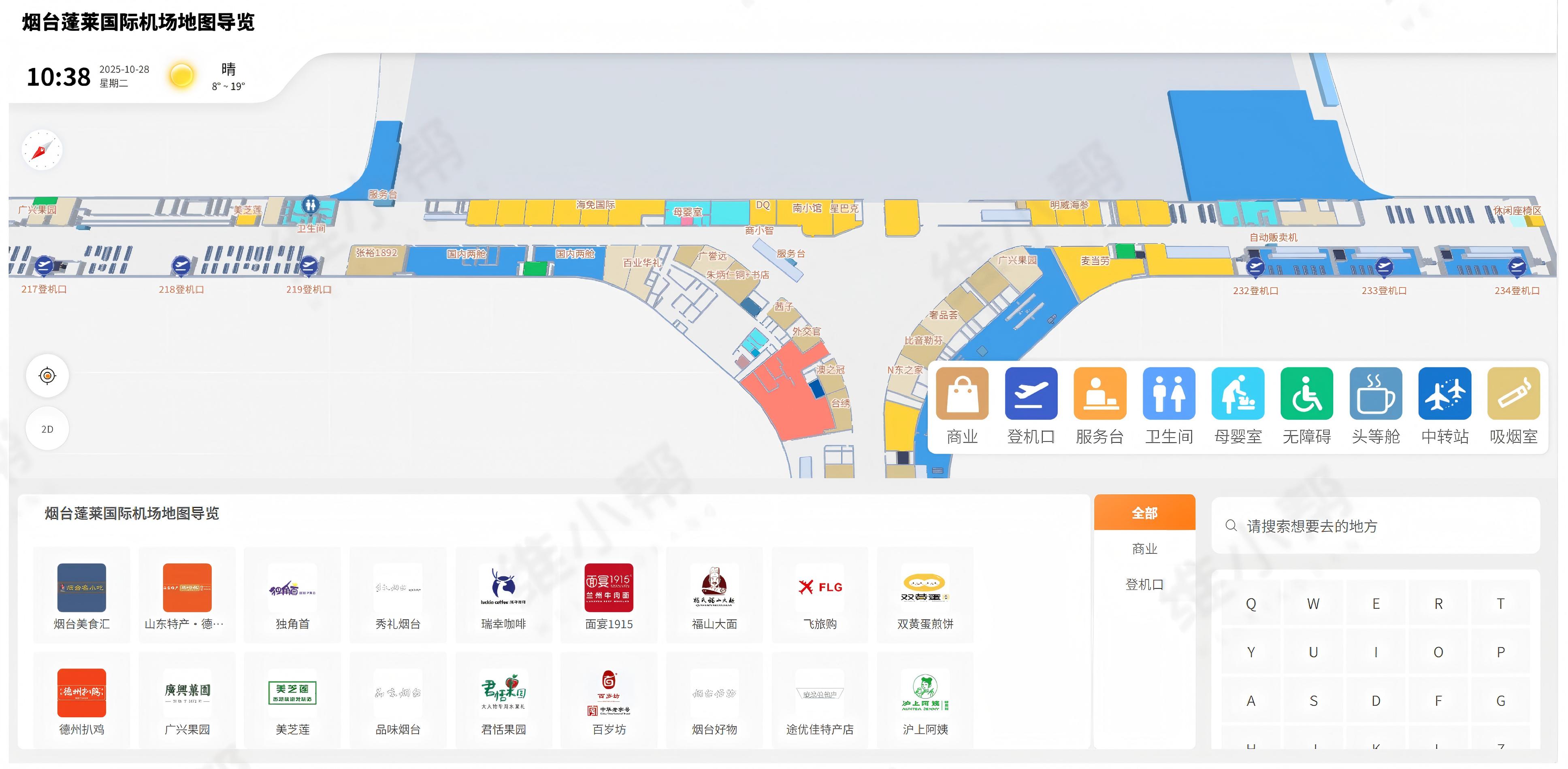 由于机场内功能区域众多,旅客在出行过程中极易迷失方向,经常需要寻找卫生间、服务台、登机口等设施,而现有的标识无法提供实时位置指引,难以快速到达目的地。