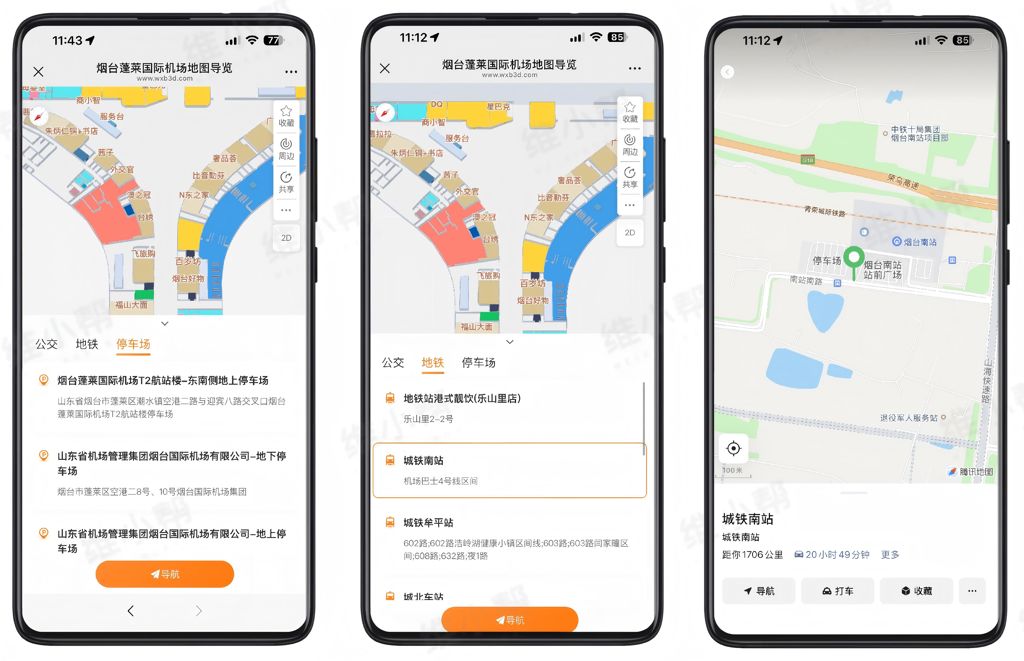 在导航系统中集成机场周边公交、地铁、停车场的实时信息与导航服务,清晰标注周边交通站点位置以及乘坐路线规划,支持无缝切换第三方导航,提供便捷出行体验。