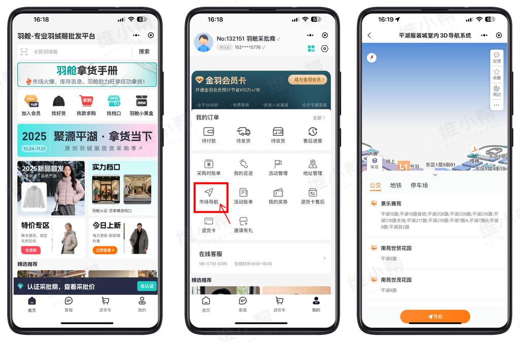 ① 嵌入“羽舱”小程序,支持线上和线下一体化导购,点击“市场导航”即可快速寻店;