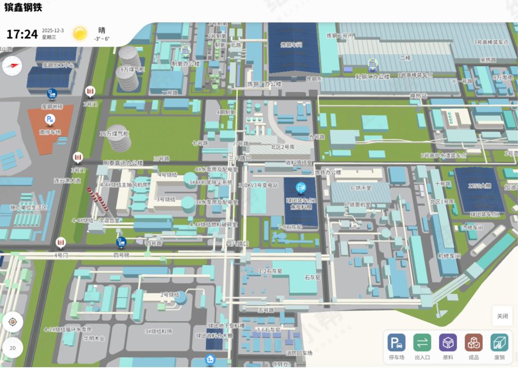 镔鑫钢铁作为中国民营企业及制造业双500强、优秀钢铁企业品牌,2025年成功跻身江苏省绿色工厂行列。为破解5000亩厂区寻路难、物流调度滞、数据分散等痛点,维构科技打造的工厂导航系统,以3D建模、GPS/AR导航及多系统对接,助力厂区高效管控与精准决策,为绿色工厂实现数智化运营提供关键技术支撑。