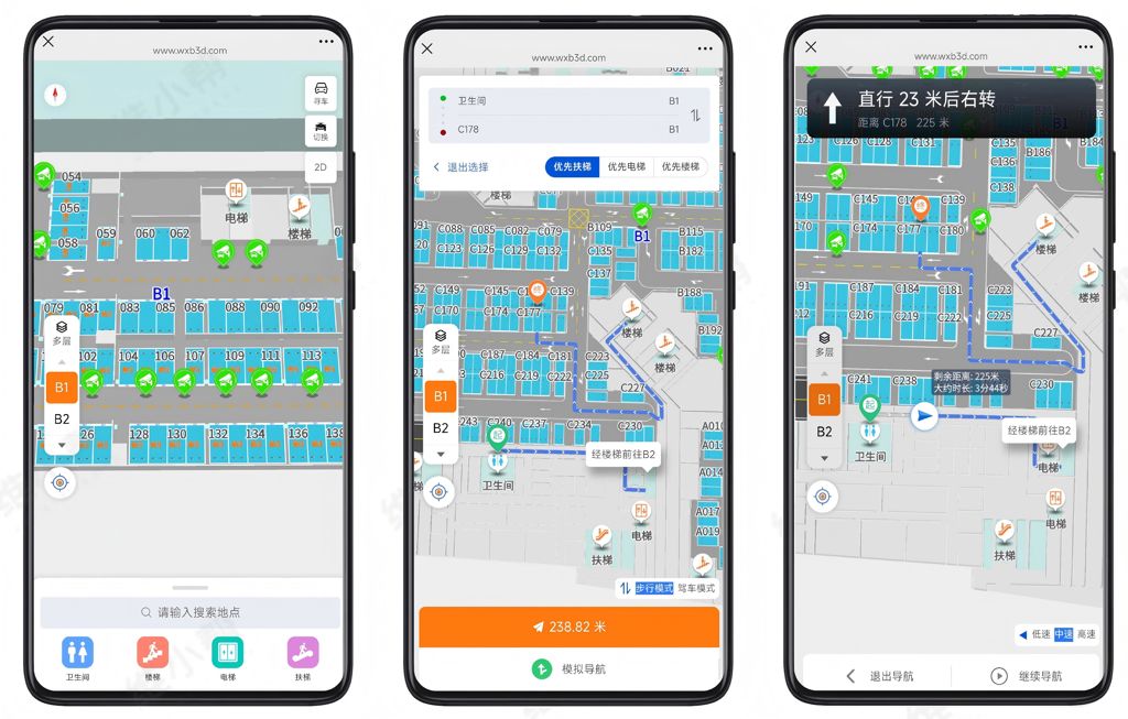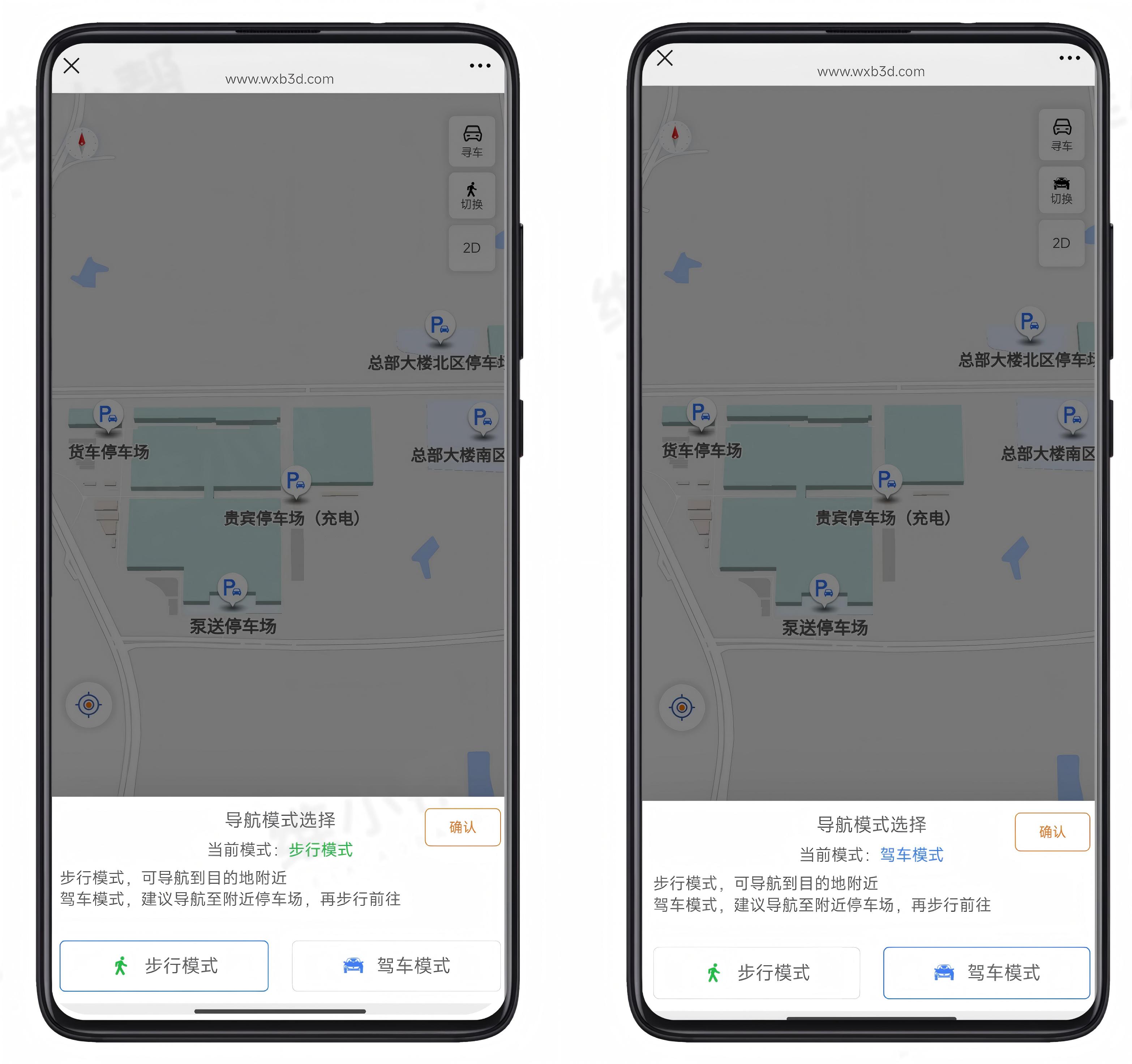 支持车辆导航与行人导航的灵活切换。车主驾车时启用车辆导航模式引导停车,停车后可一键切换至行人导航模式,通过手机端实时指引快速返回办公区、接待区等目的地,适配“停车-出行”全流程需求。