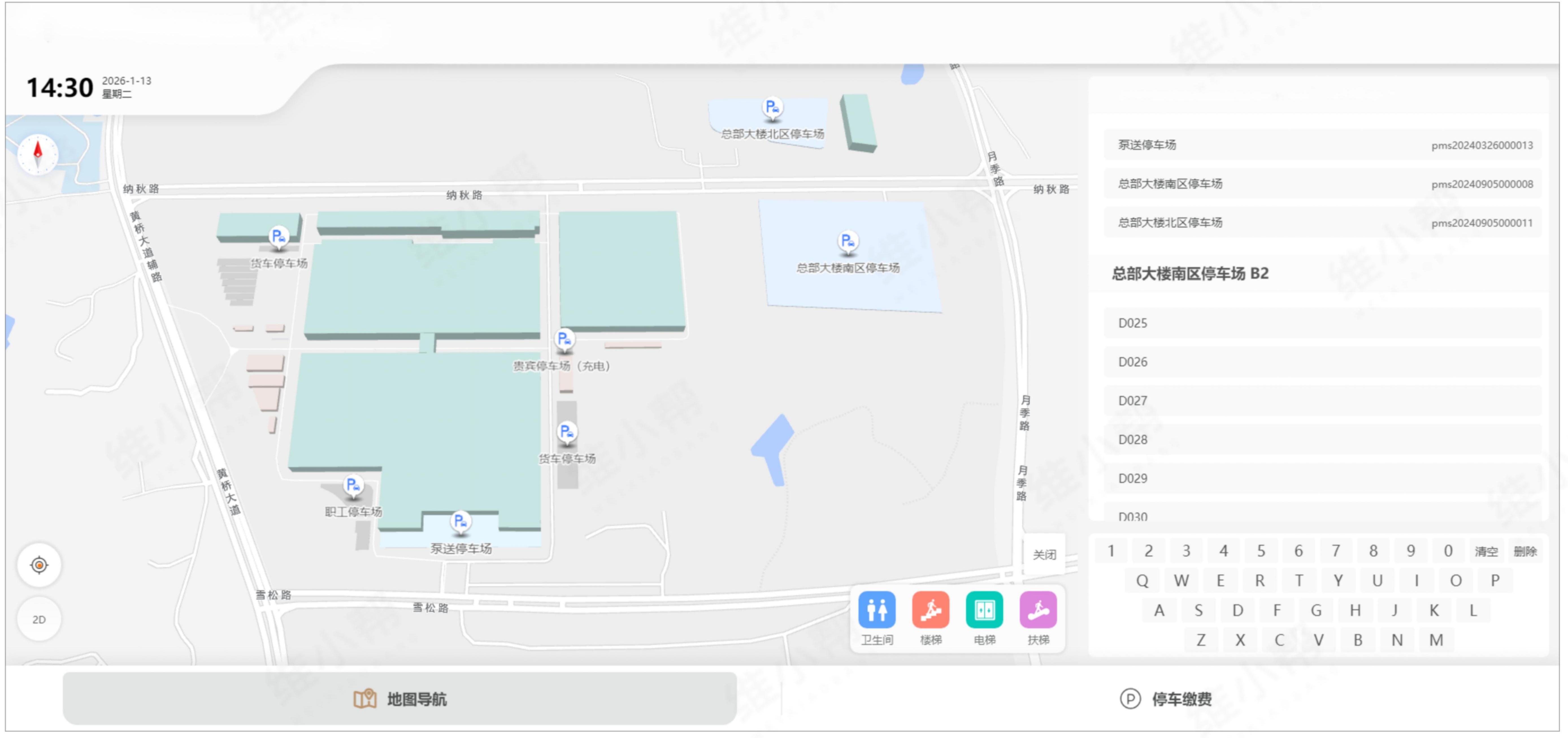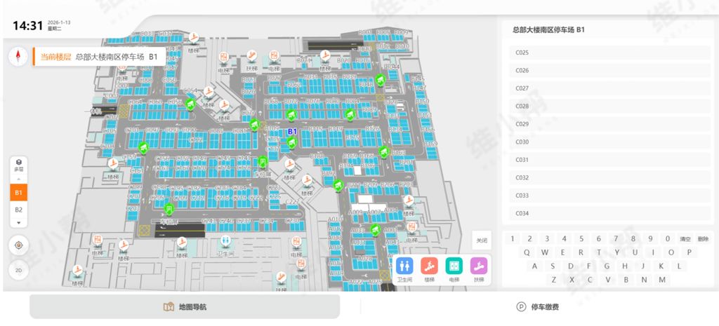 专为7万平方米停车场定制开发三维电子地图,全方位还原停车场整体布局、通道走向、2800个车位的具体分布等核心信息。通过立体可视化呈现,打破传统平面地图局限,让员工和访客清晰掌握停车场结构,快速锁定目标区域,为后续停车、寻车提供基础支撑,提升使用便捷性。