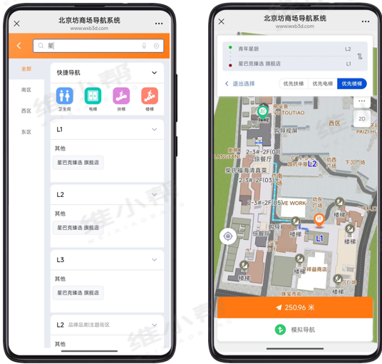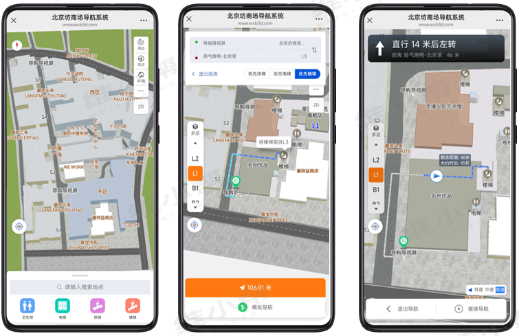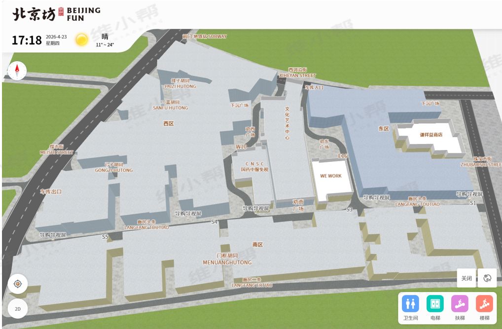 针对以上痛点,为北京坊量身打造3D 室内外一体化导航导览系统,以科技赋能空间服务,全面提升游客体验与园区运营效率。