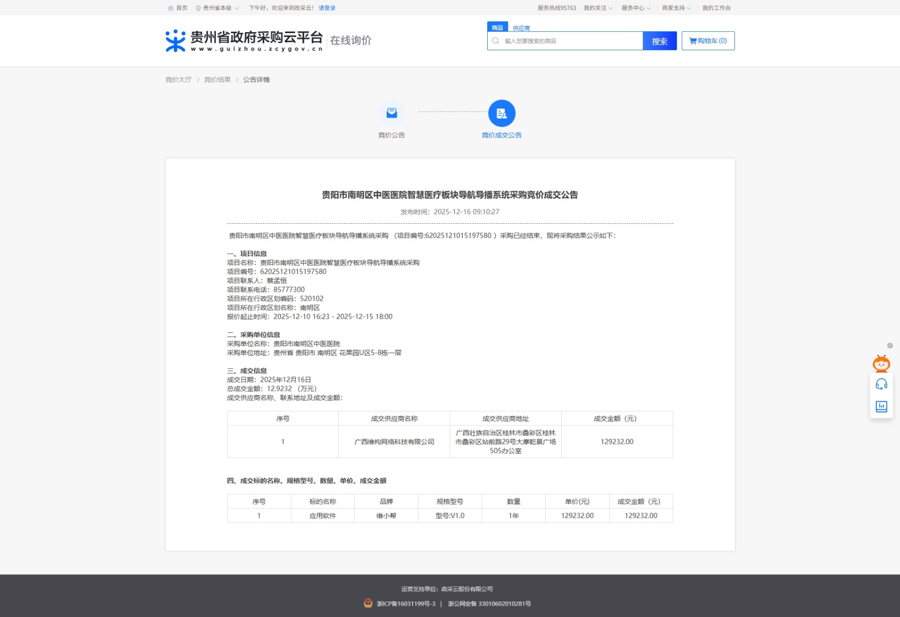 在本次采购竞价过程中,广西维构凭借贴合医疗场景的导航解决方案、成熟的技术落地经验,从竞争中成功胜出。项目服务期限为1年,服务全程将严格遵循智慧医疗领域相关规范与标准,保障系统稳定、高效运行。