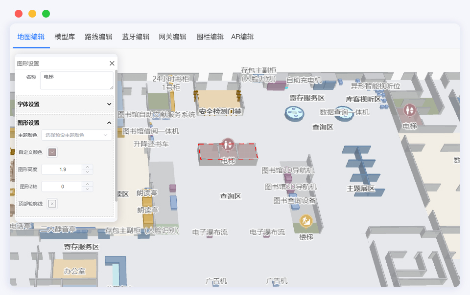 维小帮运用Three.js 3D 渲染技术,自主研发国产化的室内地图引擎,具备POI标记、路线规划、地图编辑、模型库等模块化功能,实现0基础快速绘制室内地图。