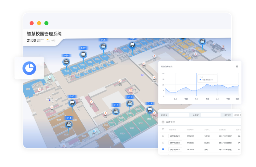 搭建资产3D场景,集成校园资产管理系统,实现资产数据可视化管理,资产数据实时监控。